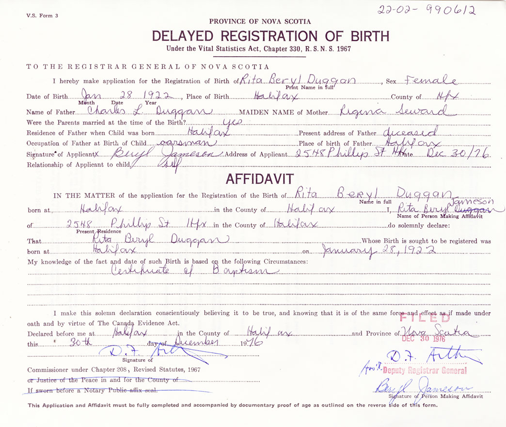 I hereby make application for the Registration of Birth of Rita BerylDuggan Sex Female