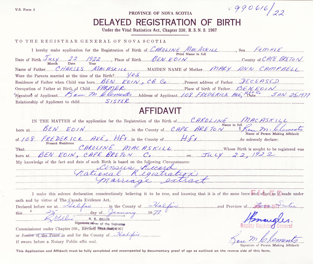 I hereby make application for the Registration of Birth of CarolineMacAskill Sex Female