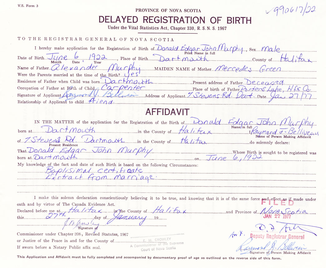 born at Dartmouth Halifax County on June 6, 1922
