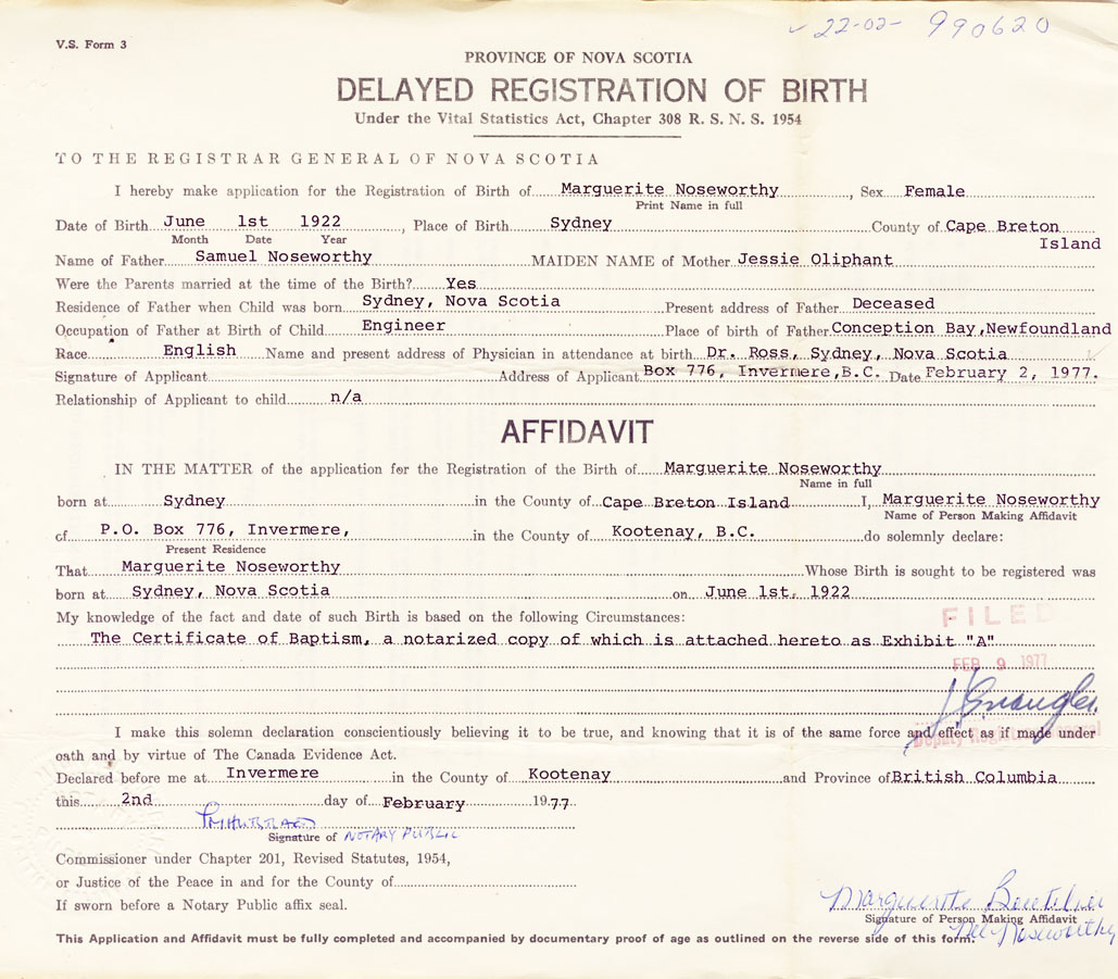 IN THE MATTER of the application for the Registration of the Birth of MargueriteNoseworthy