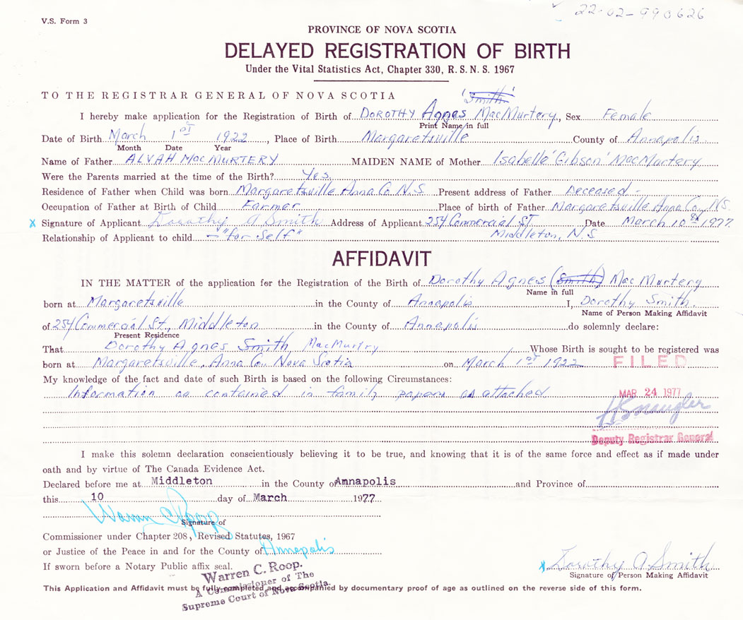 I hereby make application for the Registration of Birth of Dorothy AgnesMacMurtery Sex Female