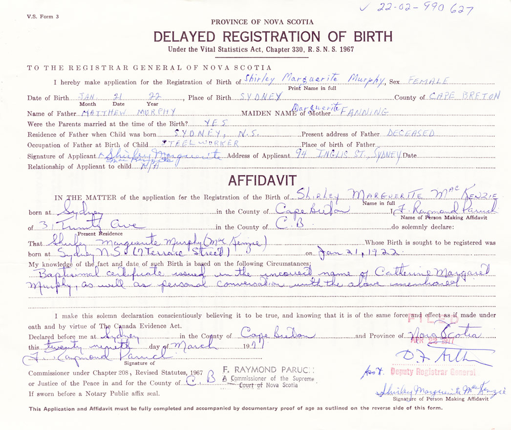Date of Birth January 21, 1922 Place of Birth SydneyCounty of Cape Breton