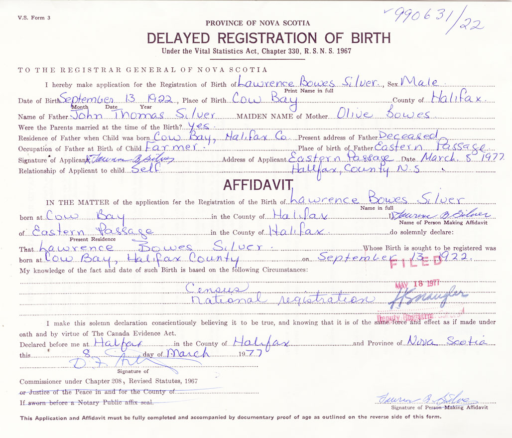 Date of Birth September 13, 1922 Place of Birth Cow BayCounty of Halifax