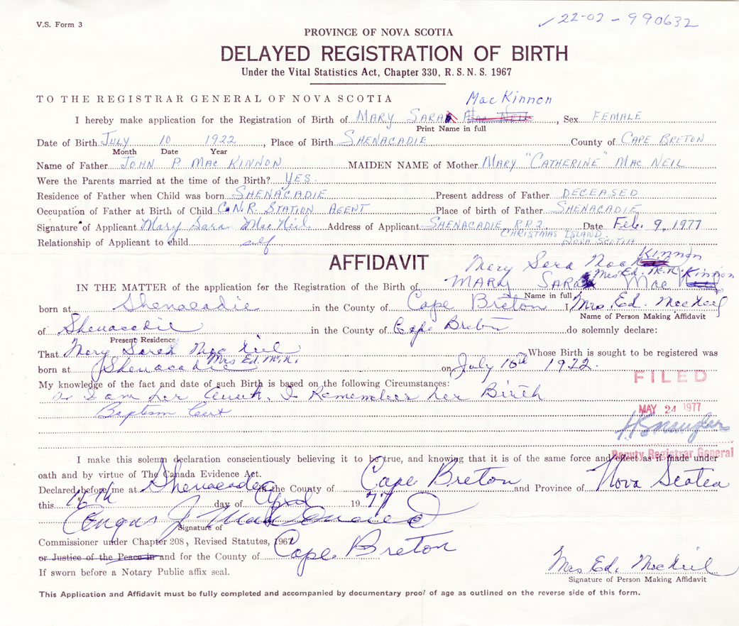Date of Birth July 10, 1922 Place of Birth ShenacadieCounty of Cape Breton