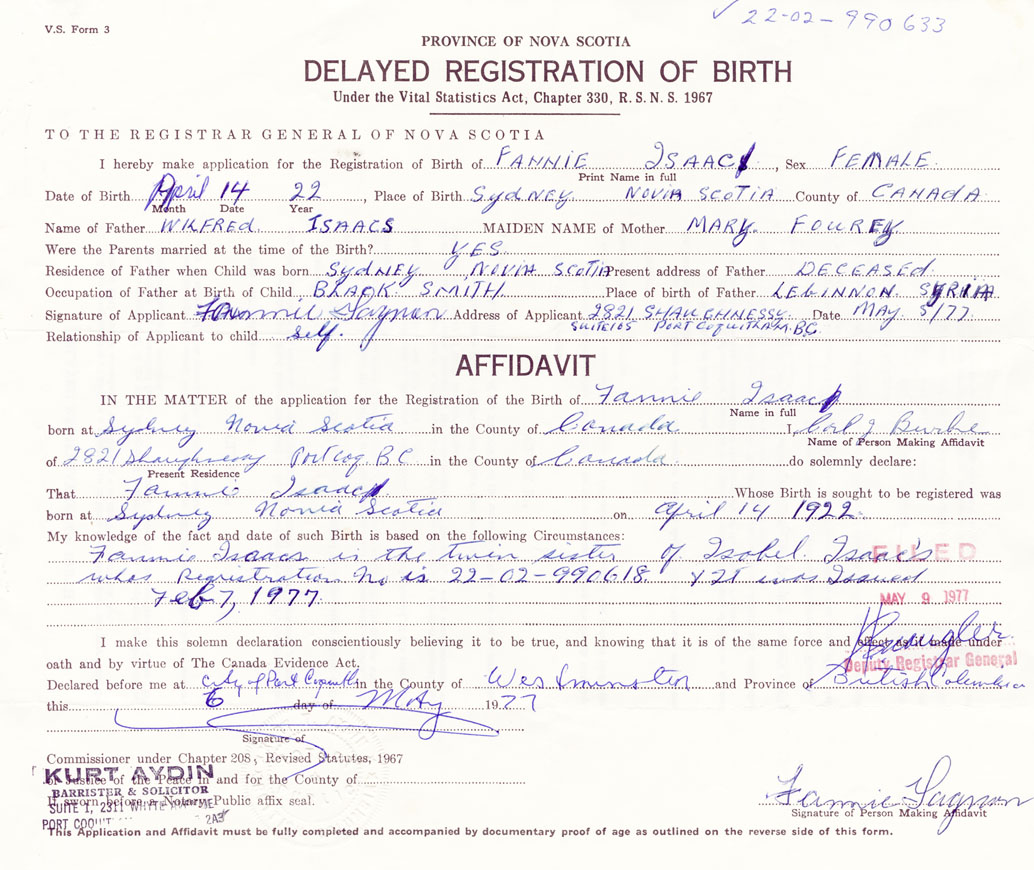 Fannie Isaac is the twin sister of Isobel Isaac whose registration number is 22-02-990618 and it was issued 7 February 1977.