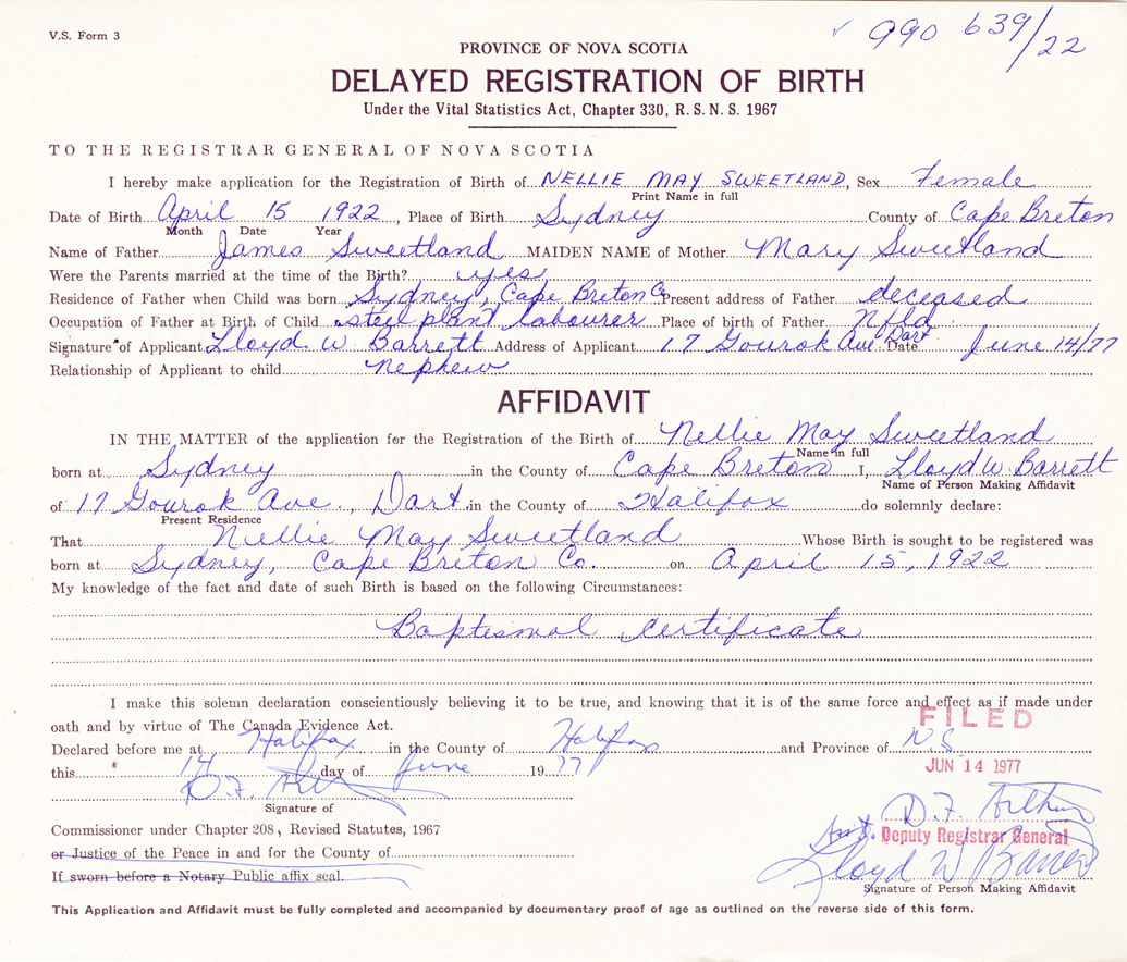 Date of Birth April 15, 1922 Place of Birth SydneyCounty of Cape Breton