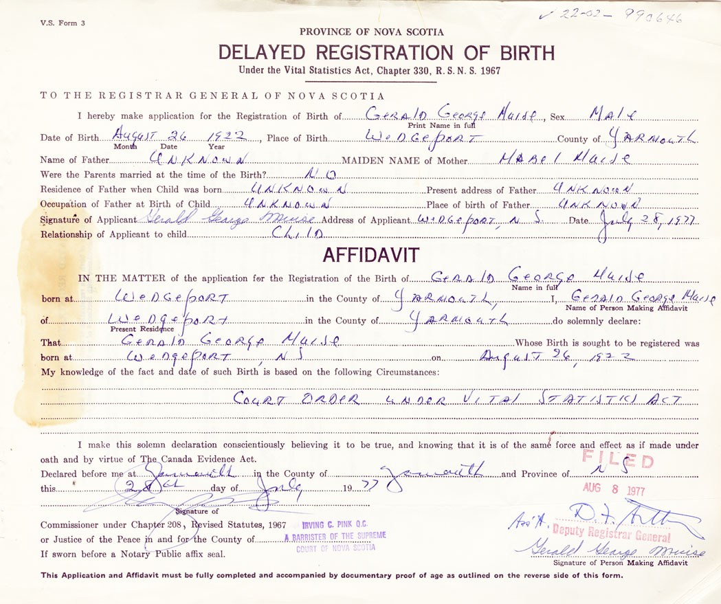 Signature of Applicant Gerald George Muise Address of Applicant Wedgeport, Yarmouth Date 28 July 1977