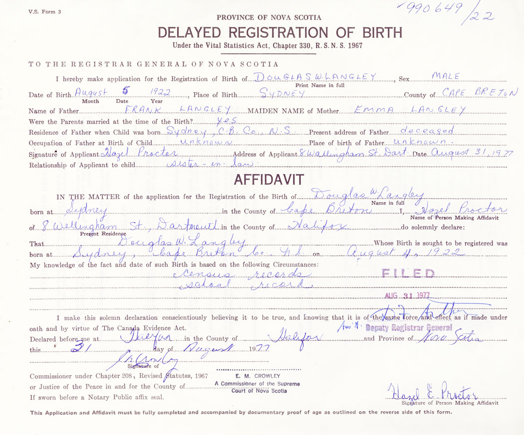I hereby make application for the Registration of Birth of Douglas W.Langley Sex Male