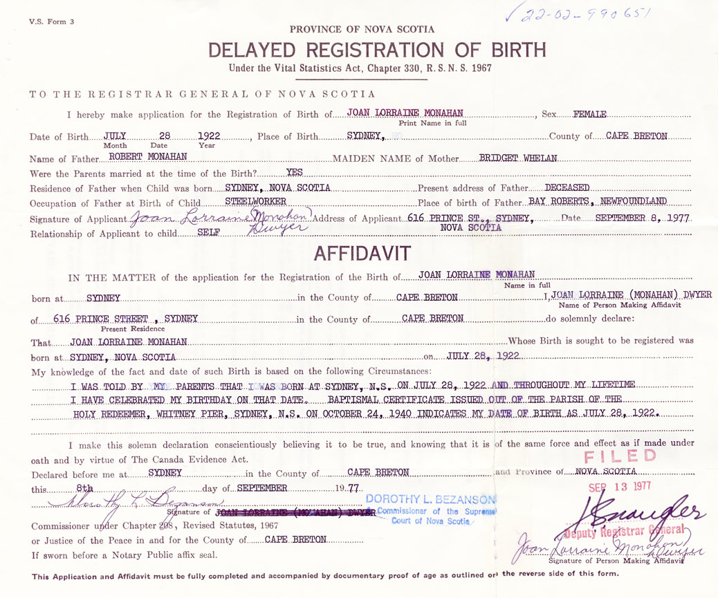 I was told by my parents that I was born at Sydney on July 28, 1922 and throughout my lifetime I have celebrated my birthday on that date. Baptismal certificate issued out of the Parish of the Holy Redeemer, Whitney Pier, Sydney on October 24, 1940 indicates my date of birth as July 28, 1922.
