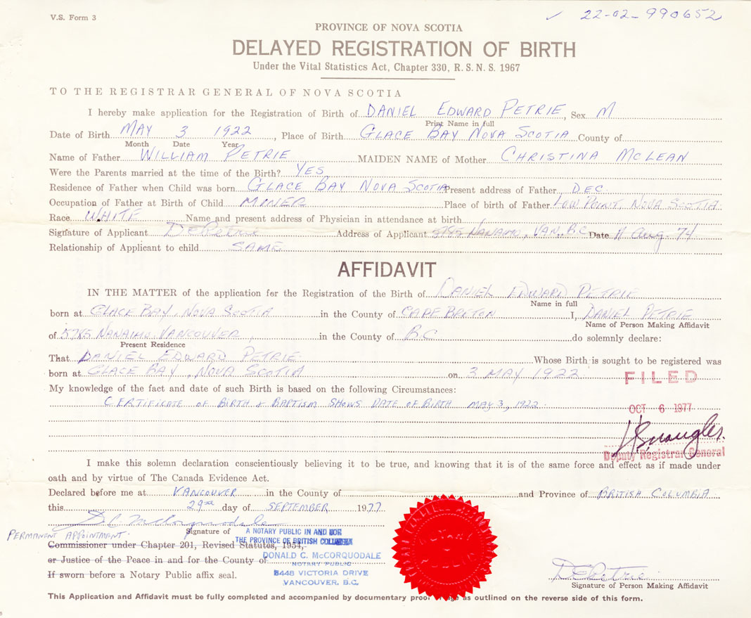 I hereby make application for the Registration of Birth of Daniel EdwardPetrie Sex Male