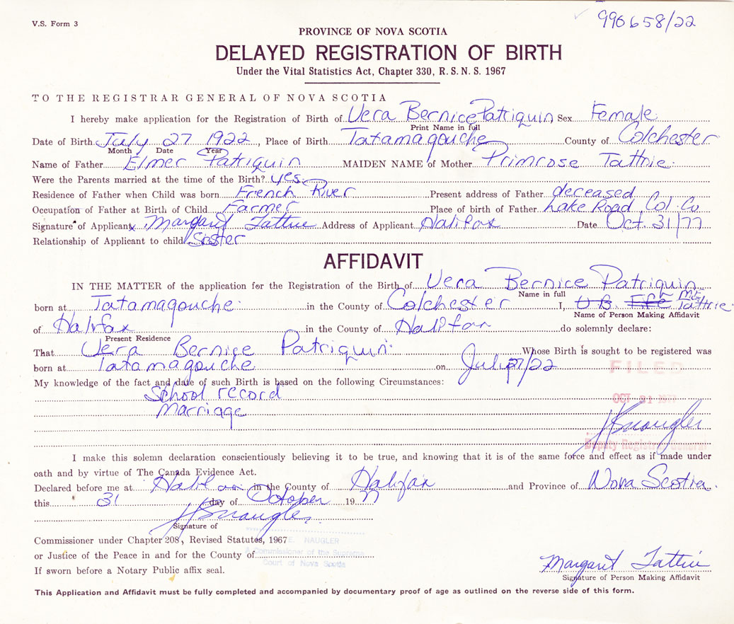 I hereby make application for the Registration of Birth of Vera BernicePatriquin Sex Female