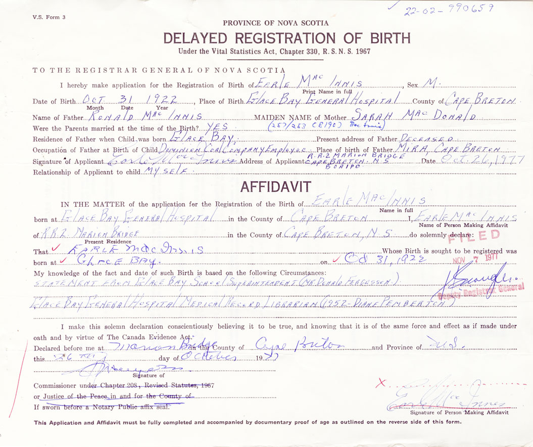 I hereby make application for the Registration of Birth of EarleMacInnis Sex Male