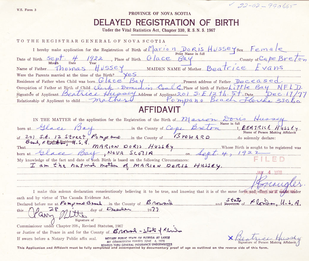 I hereby make application for the Registration of Birth of Marion DorisHussey Sex Female