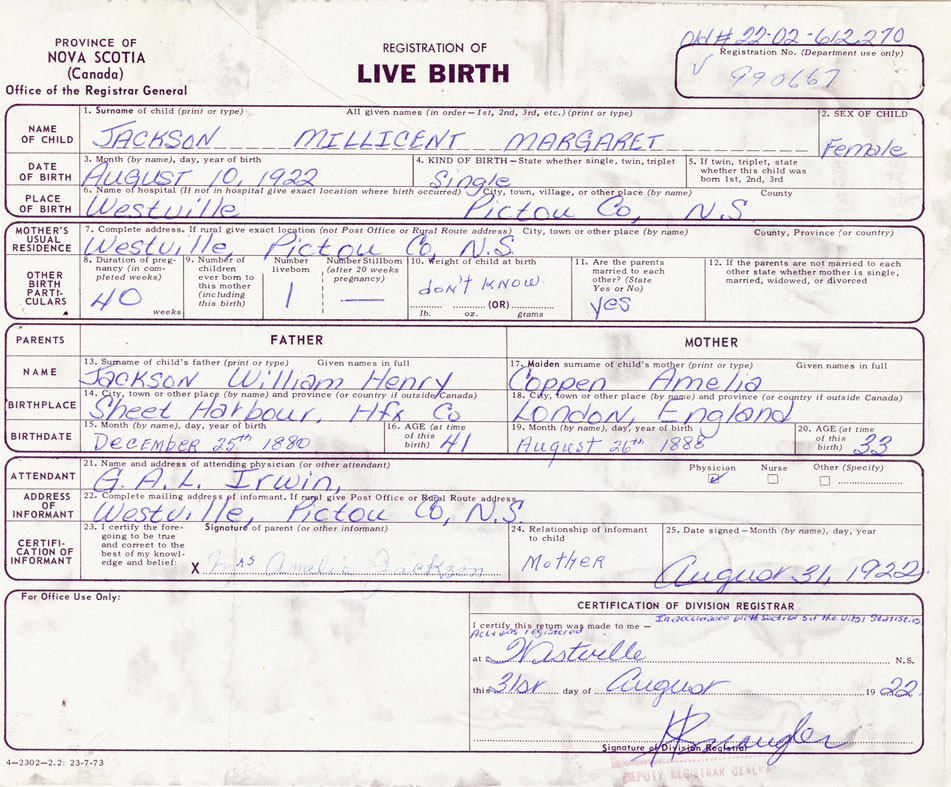 Date of Birth August 10, 1922 Place of Birth WestvilleCounty of Pictou