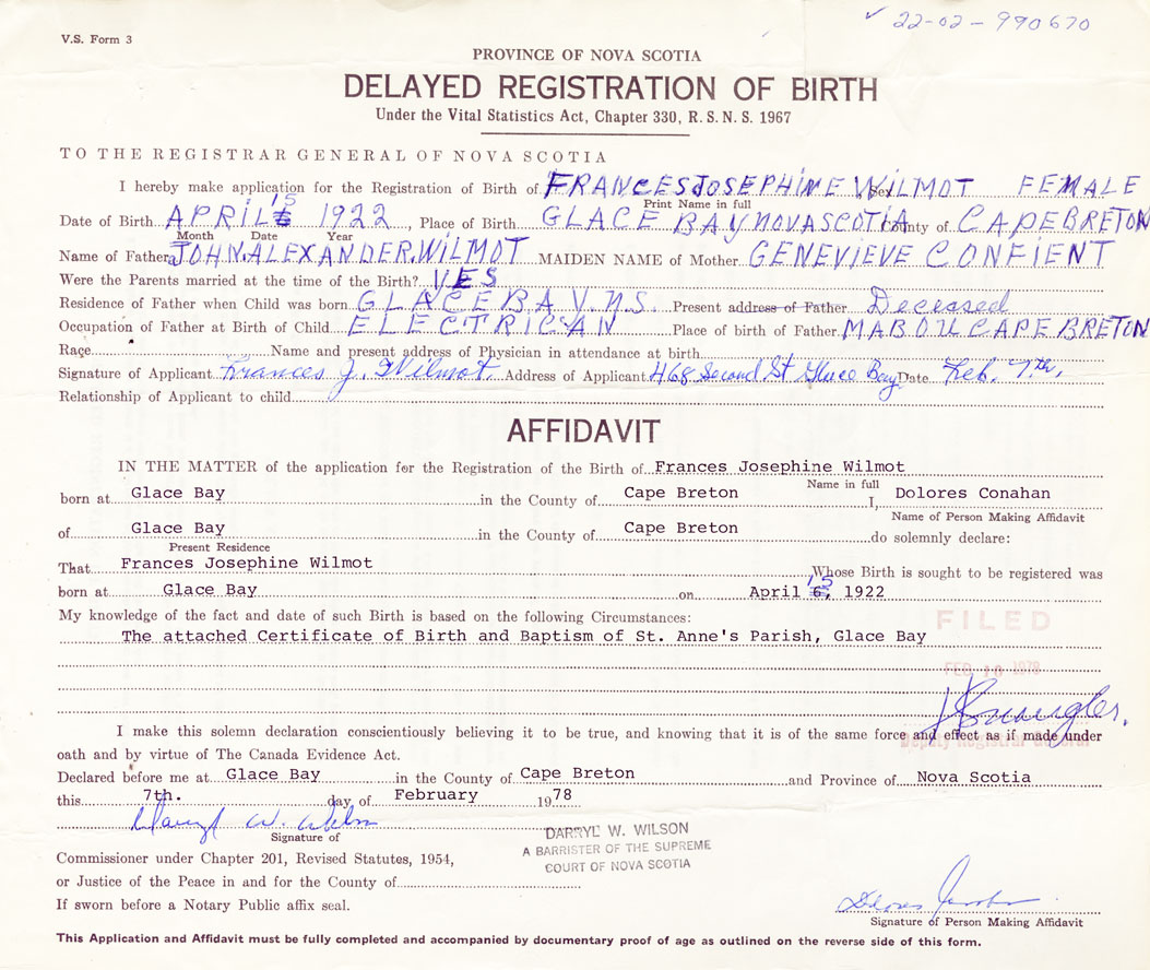 Signature of Applicant Frances J. Wilmot Address of Applicant 468 Second Street, Glace Bay, Cape Breton Date 7 February 1978