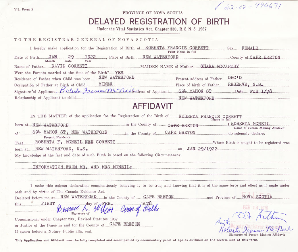 Signature of Applicant Roberta Frances McNeil Address of Applicant 694 Mahone Street, New Waterford, Cape Breton Date 1 February 1978