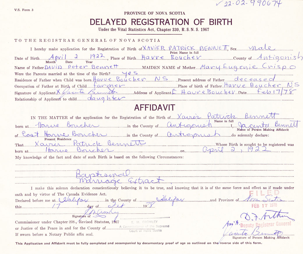 Date of Birth April 2, 1922 Place of Birth Havre BoucherCounty of Antigonish