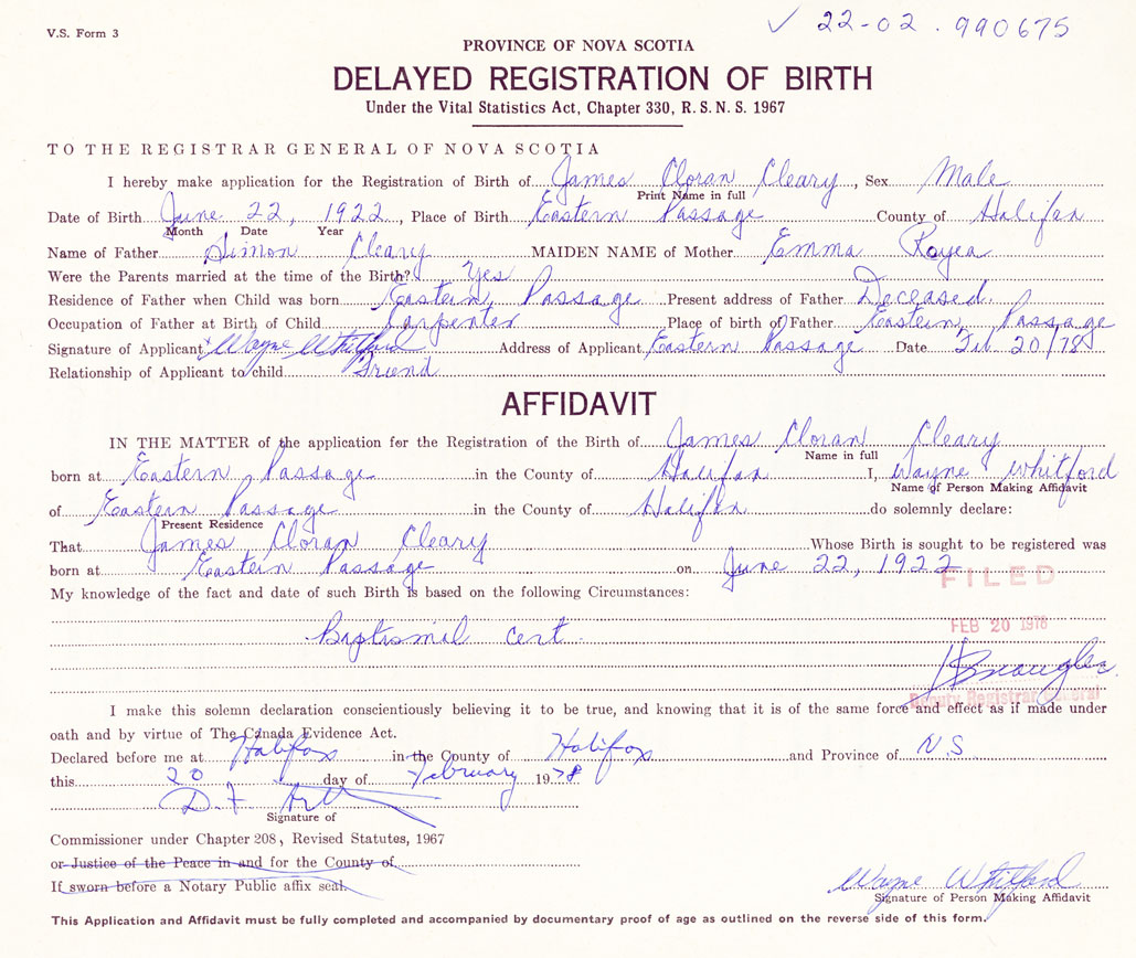 Date of Birth June 22, 1922 Place of Birth Eastern PassageCounty of Halifax