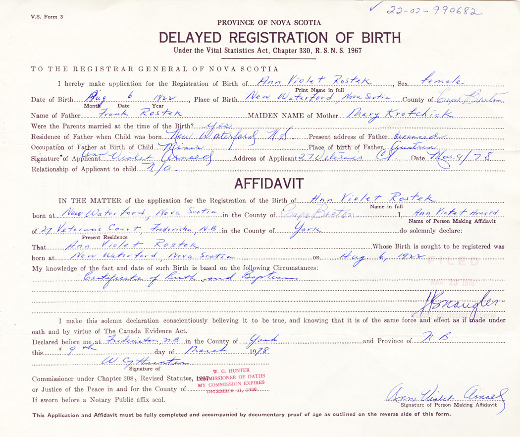 Date of Birth August 6, 1922 Place of Birth New WaterfordCounty of Cape Breton