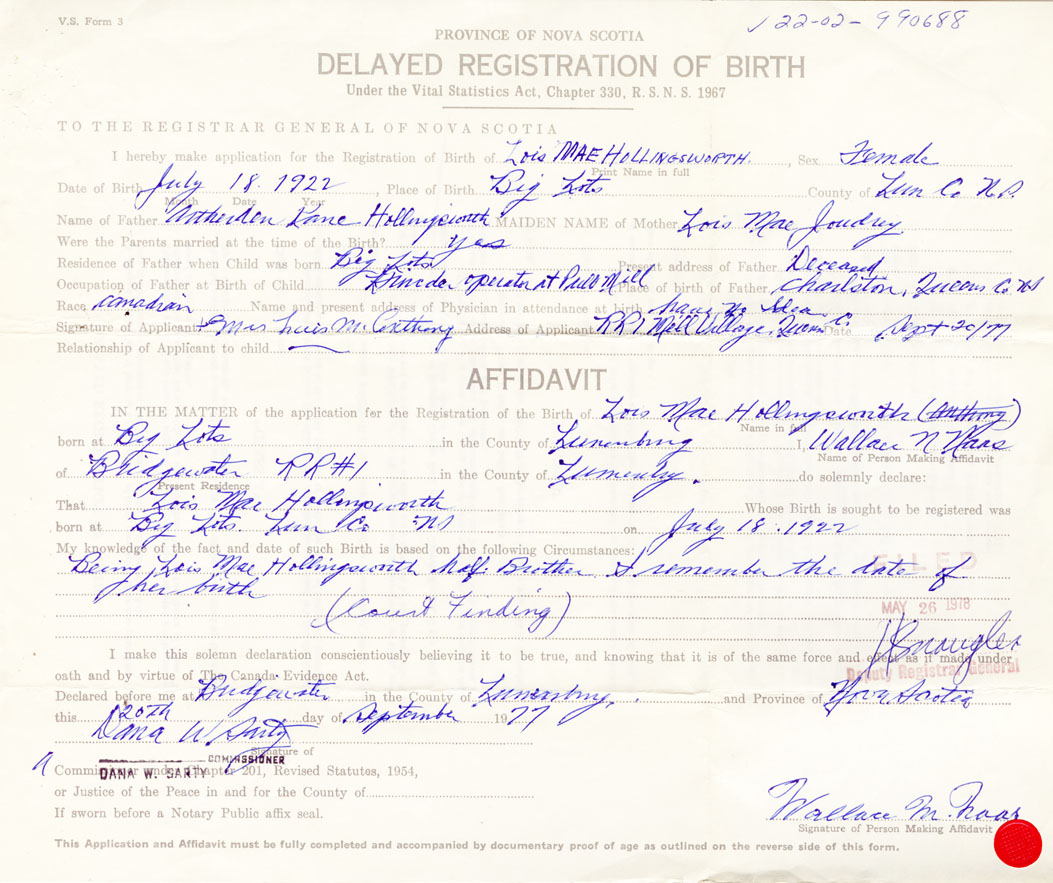 I hereby make application for the Registration of Birth of Lois MaeHollingsworth Sex Female
