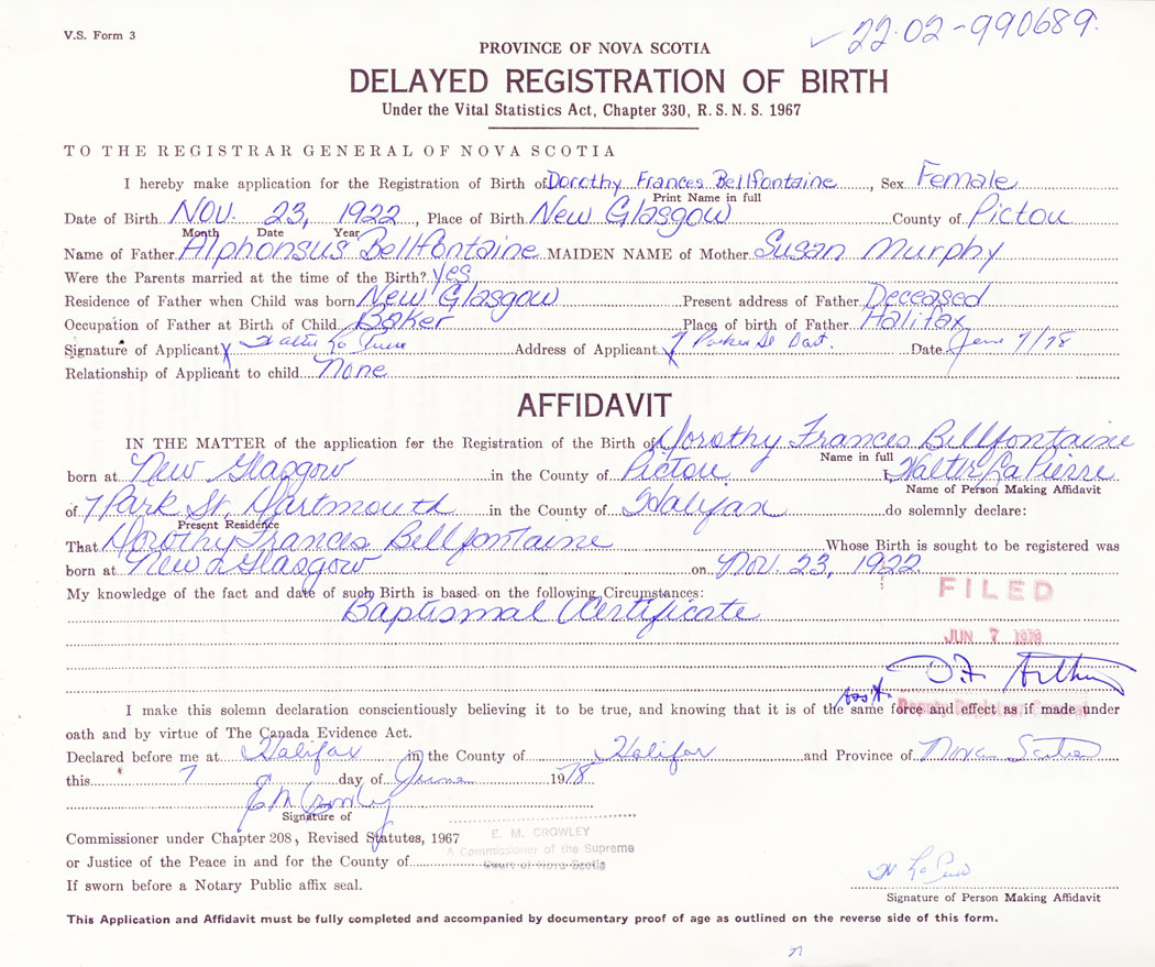 IN THE MATTER of the application for the Registration of the Birth of Dorothy FrancesBellfontaine