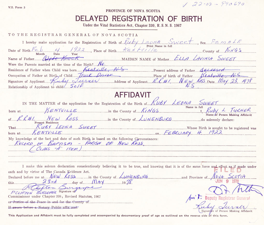 Signature of Applicant Ruby Turner Address of Applicant RR #1, New Ross, Lunenburg Date 23 May 1978