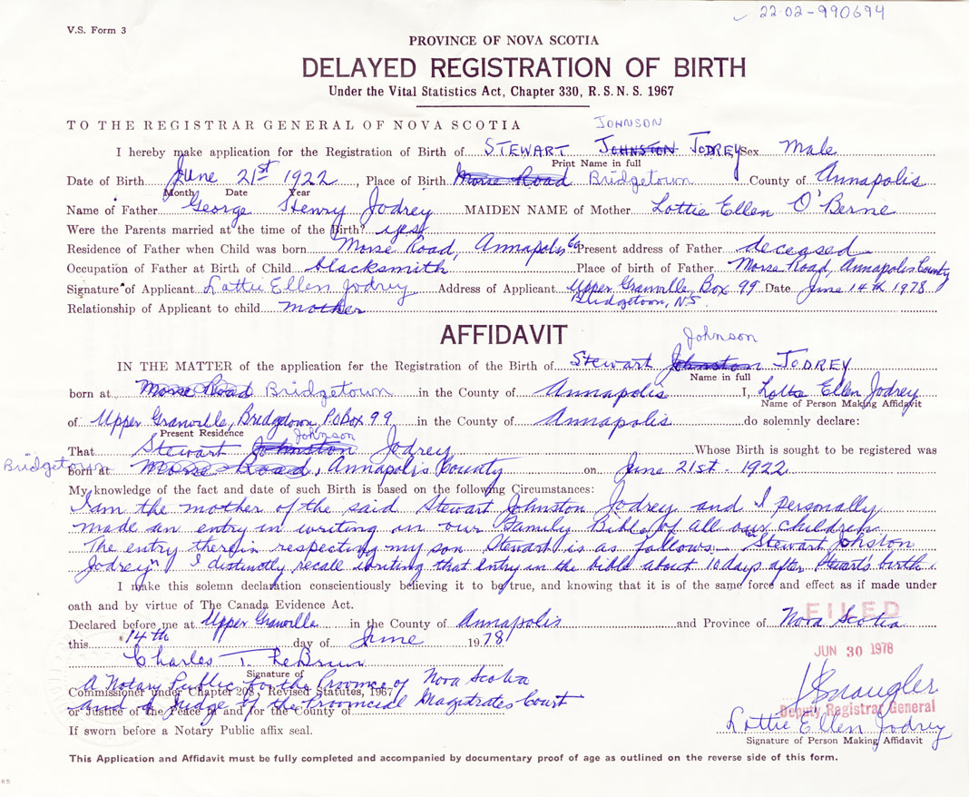I am the mother of the said Stewart Johnston Jodrey and I personally made an entry in writing in our family bible of all our children. The entry therein respecting my son Stewart is as follows: Stewart Johnston Jodrey. I distinctly recall writing that entry in the bible about 10 days after Stewarts birth.