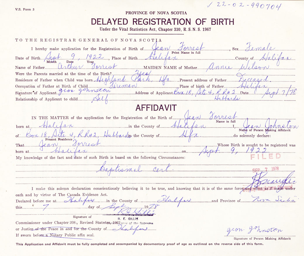 Signature of Applicant Jean Johnston Address of Applicant Box 18, site 4, RR #2, Hubbards, Halifax Date 7 September 1978