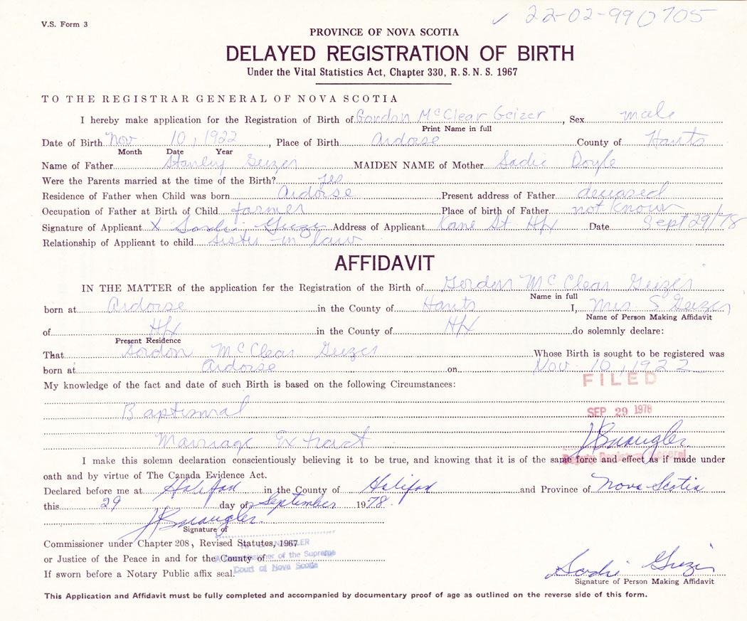 I hereby make application for the Registration of Birth of Gordon McClearGeizer Sex Male