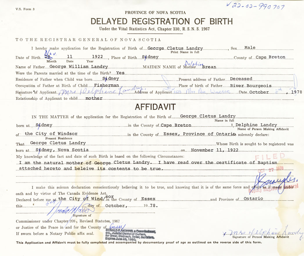 Name of Father George William Landry MAIDEN NAME of Mother Delphine Brean