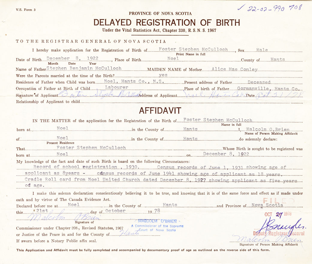 Date of Birth December 8, 1922 Place of Birth NoelCounty of Hants