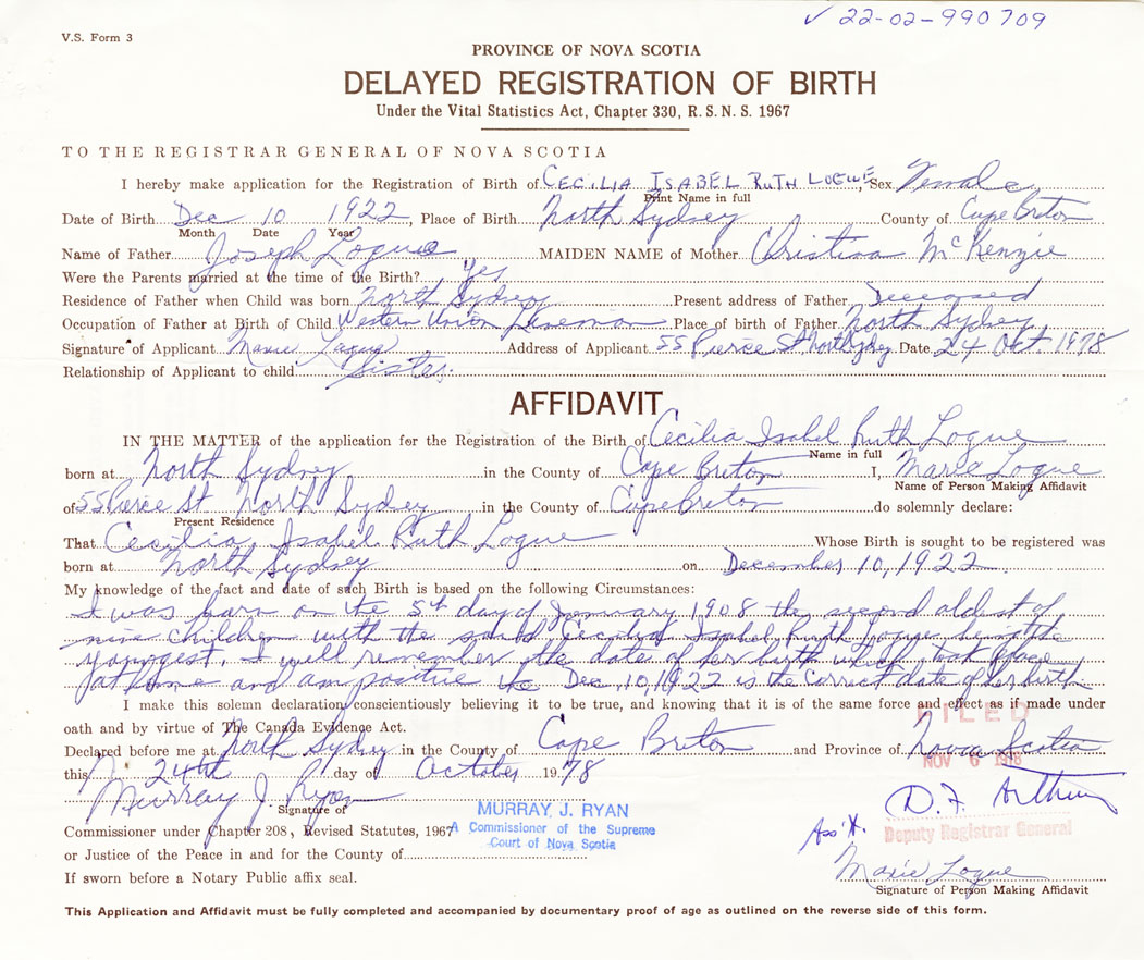 I was born on the 5th day of January 1908, the second oldest of nine children with the said Cecilia Isabel Ruth Logue being the youngest, I well remember the date of her birth which took place at home and am positive that December 10, 1922 is the correct date of her birth.
