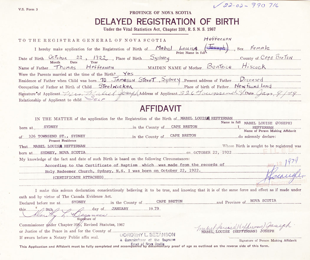 Signature of Applicant Mrs. Mabel Joseph Address of Applicant 326 Townsend Street, Sydney, Cape Breton Date 9 January 1979