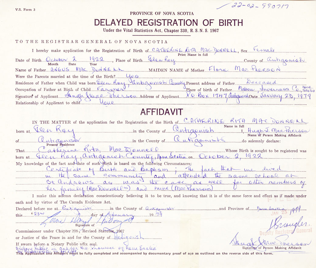 Certificate of birth and baptism; the fact that we lived in the same community and attended the same school at St. Andrews as was the case as well for other members of her family (MacDonnells) and mine (MacPhersons)