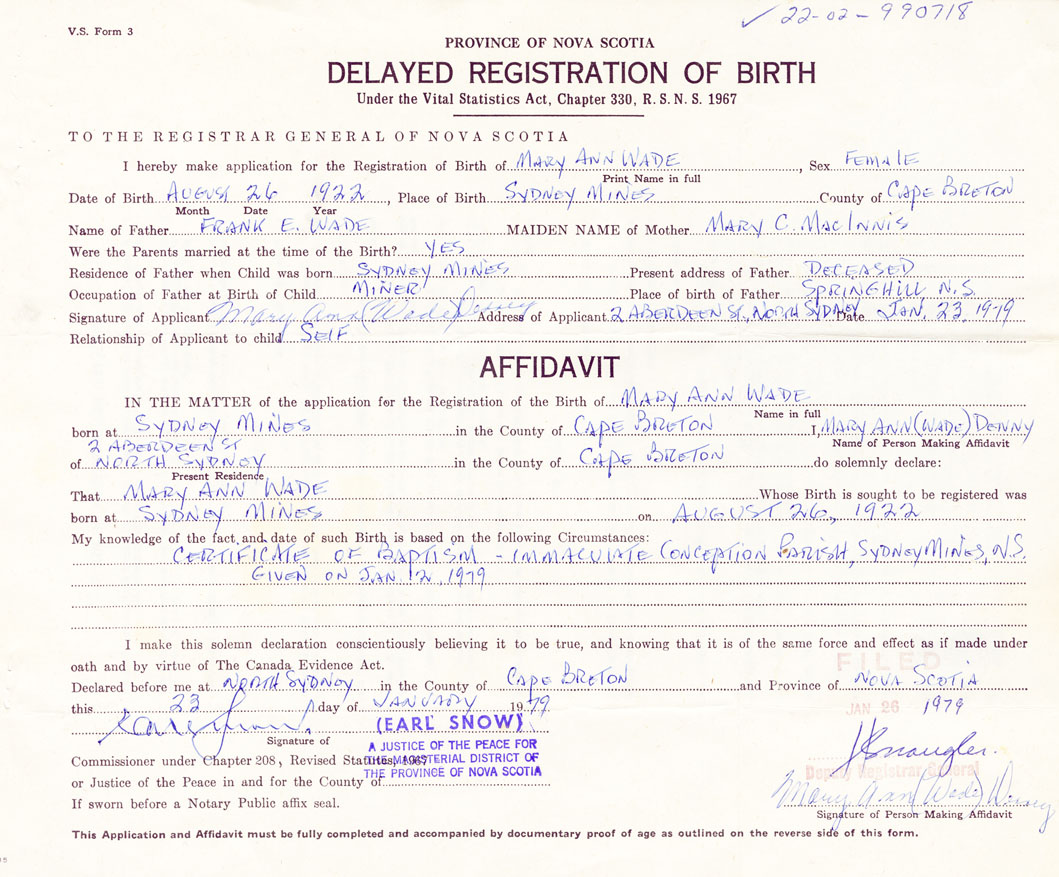 Signature of Applicant Mary Ann (Wade) Denney Address of Applicant 2 Aberdeen Street, North Sydney, Cape Breton Date 23 January 1979