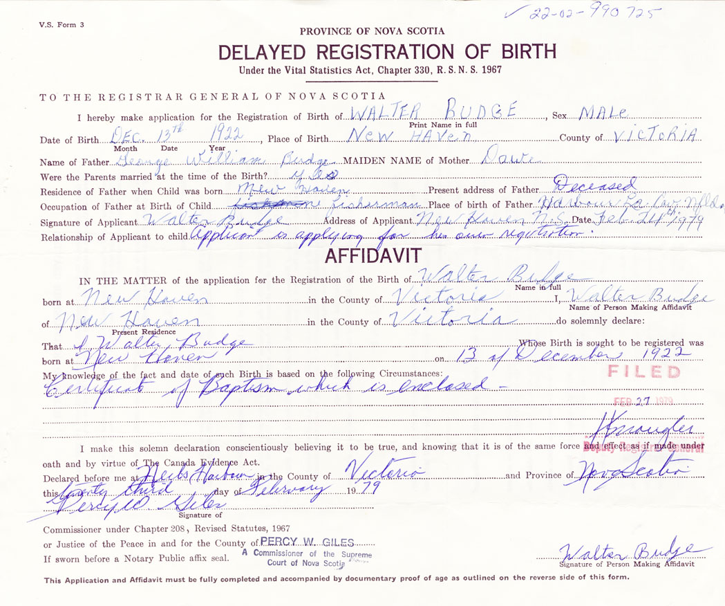 I hereby make application for the Registration of Birth of WalterBudge Sex Male