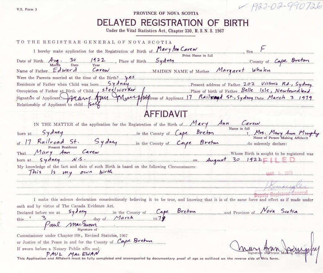 Signature of Applicant Mary Ann Murphy Address of Applicant 17 Railroad Street, Sydney, Cape Breton Date 3 March 1979