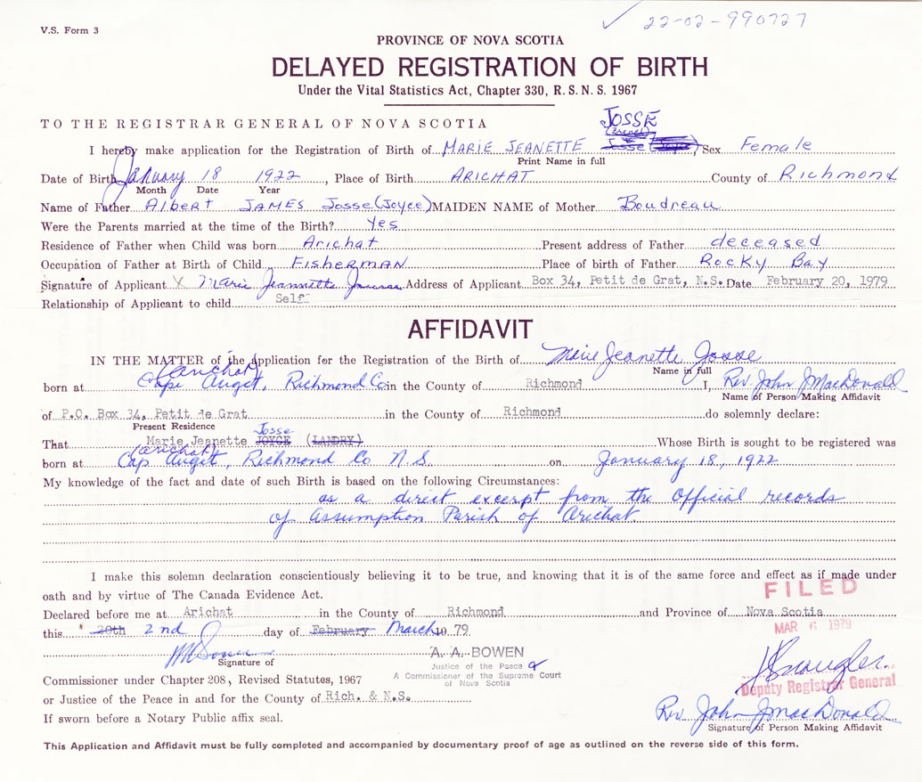 Signature of Applicant Marie Jeannette Josse Address of Applicant Box 34, Petit de Grat, Richmond Date 20 February 1979