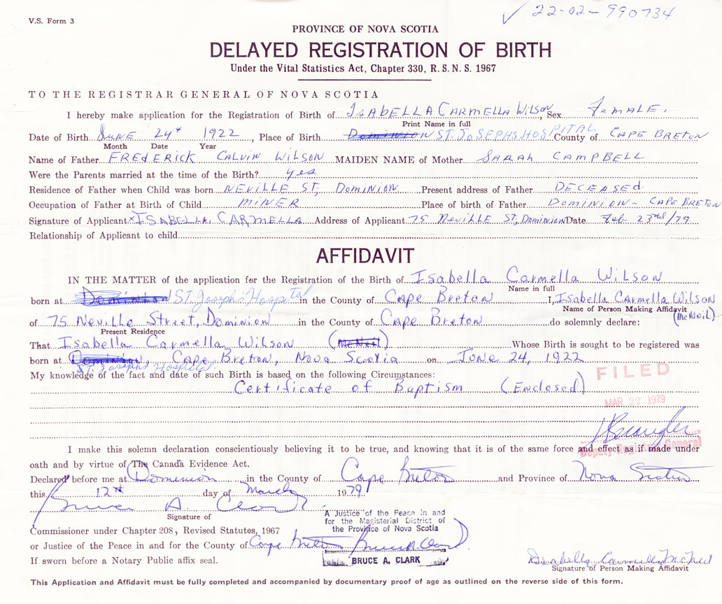 Signature of Applicant Isabella Carmella McNeil (Wilson) Address of Applicant 75 Neville Street, Dominion, Cape Breton Date 23 February 1979