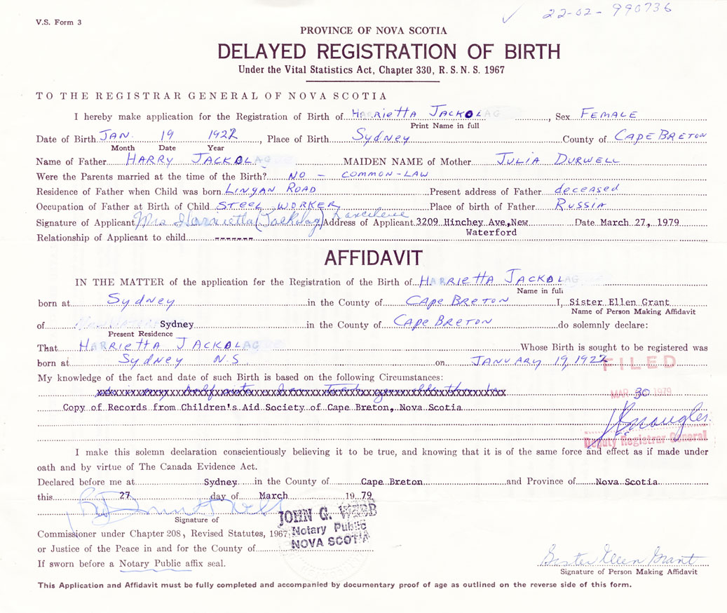 Signature of Applicant Mrs. Harrietta (Jackolag) Lanceleve Address of Applicant 3209 Hinchey Avenue, New Waterford, Cape Breton Date 27 March 1979