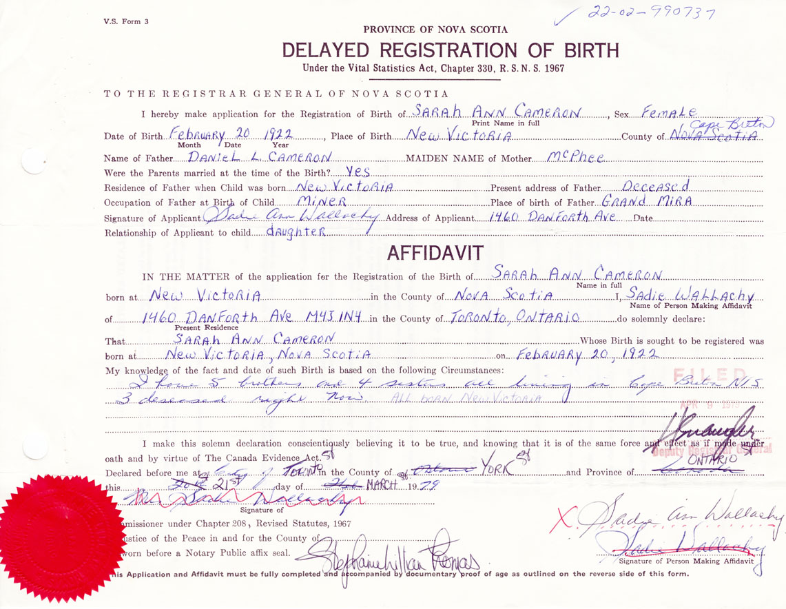 Date of Birth February 20, 1922 Place of Birth New VictoriaCounty of Cape Breton