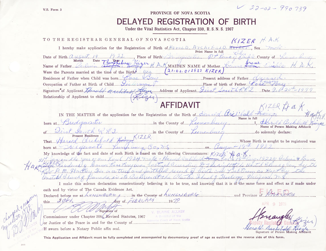 I hereby make application for the Registration of Birth of Harold ArchibaldKizer Sex Male
