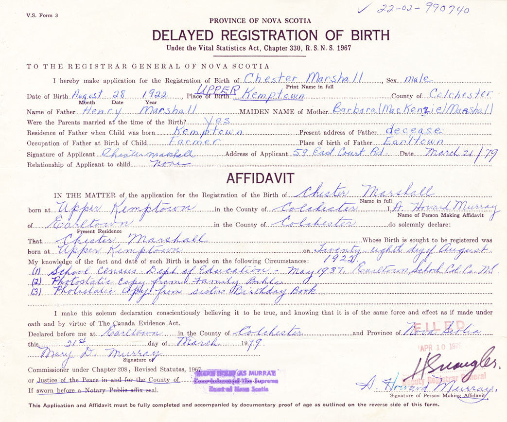 I hereby make application for the Registration of Birth of ChesterMarshall Sex Male