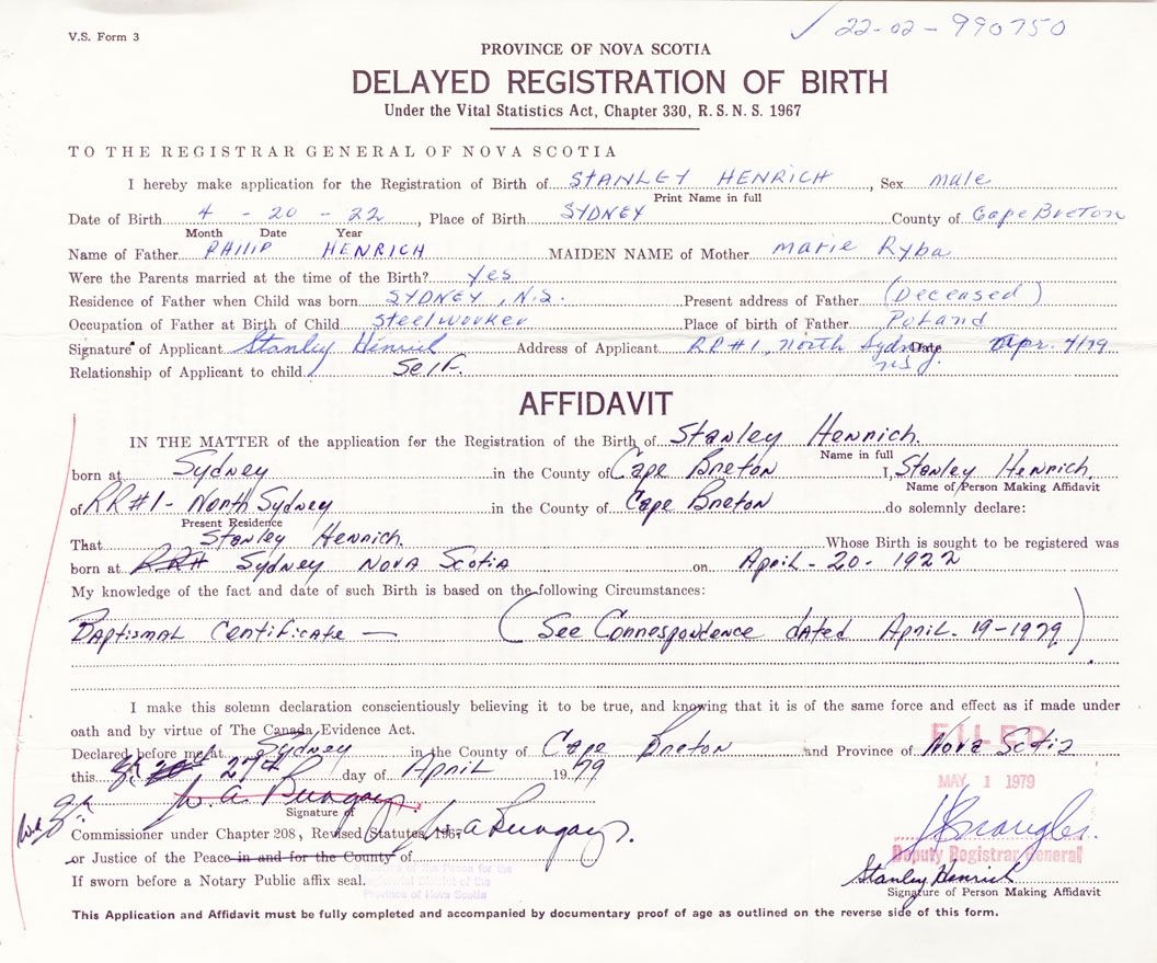 Signature of Applicant Stanley Henrich Address of Applicant RR #1, North Sydney, Cape Breton Date 4 April 1979