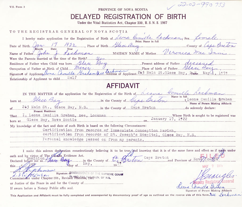 Signature of Applicant Leona Camilla Graham, nee: Lockman Address of Applicant 263 Main Street, Glace Bay, Cape Breton Date 4 May 1979