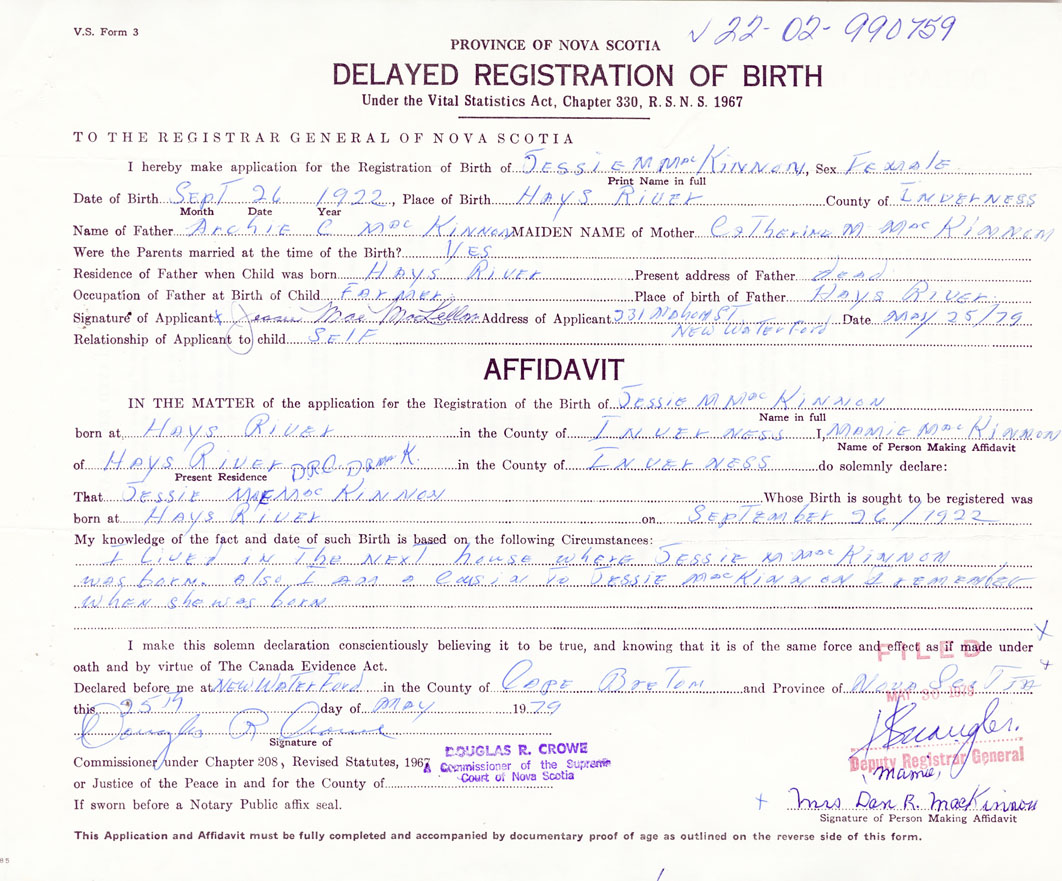 Date of Birth September 26, 1922 Place of Birth Hays RiverCounty of Inverness