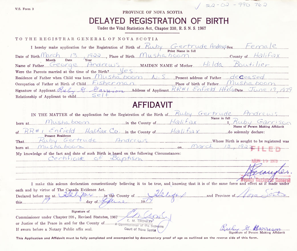 Signature of Applicant Ruby G. Garrison Address of Applicant RR #1, Enfield, Halifax Date 19 June 1979