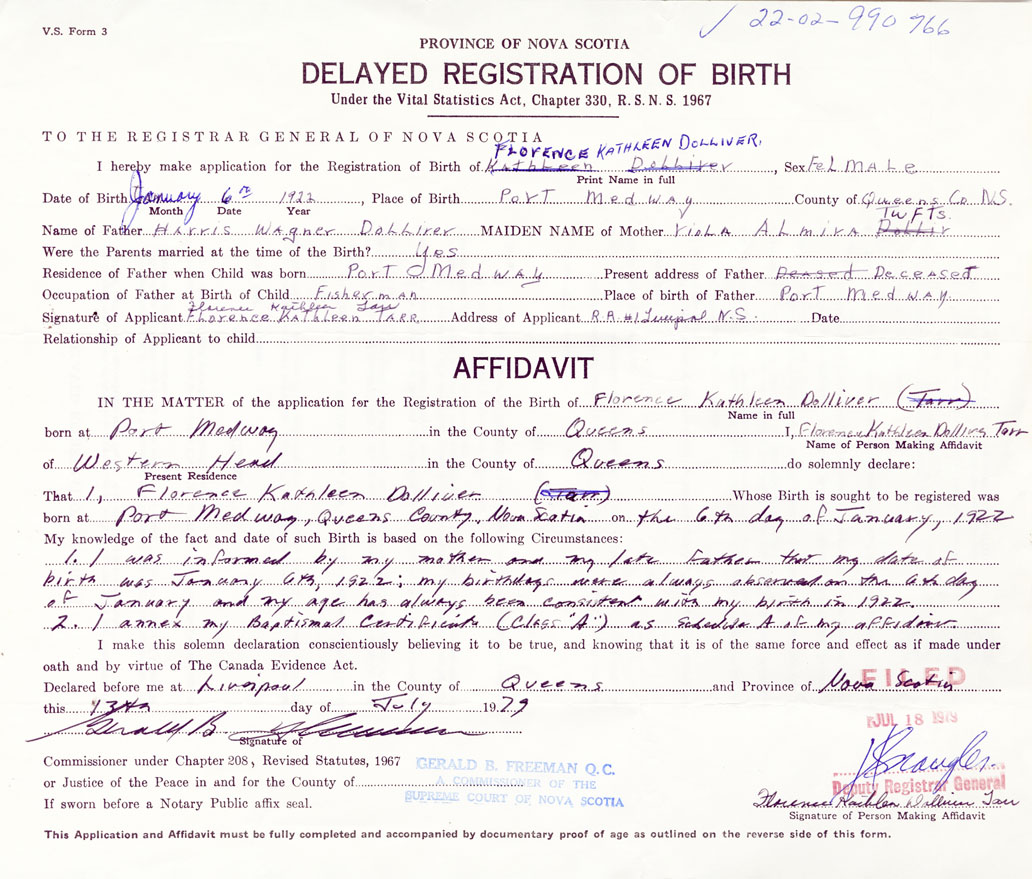 That Florence KathleenDolliver Whose Birth is sought to be registered was