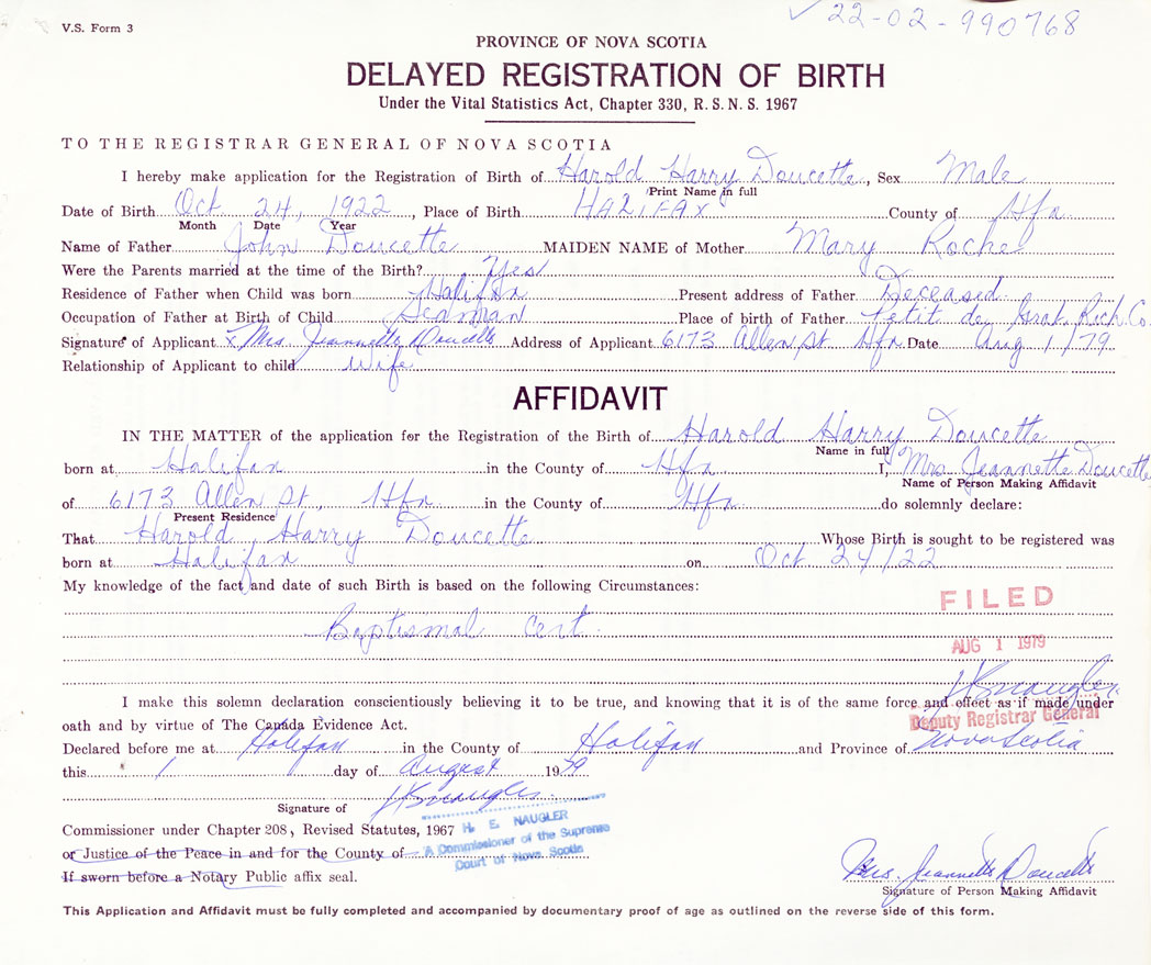 I hereby make application for the Registration of Birth of Harold HarryDoucette Sex Male