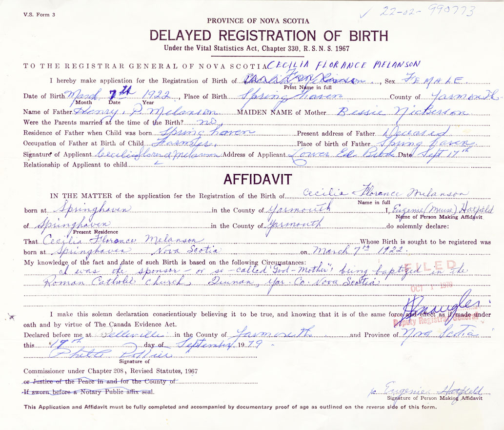 I hereby make application for the Registration of Birth of Cecilia FloranceMelanson Sex Female